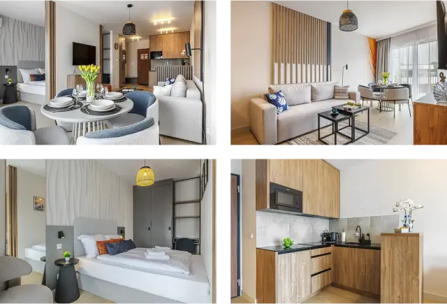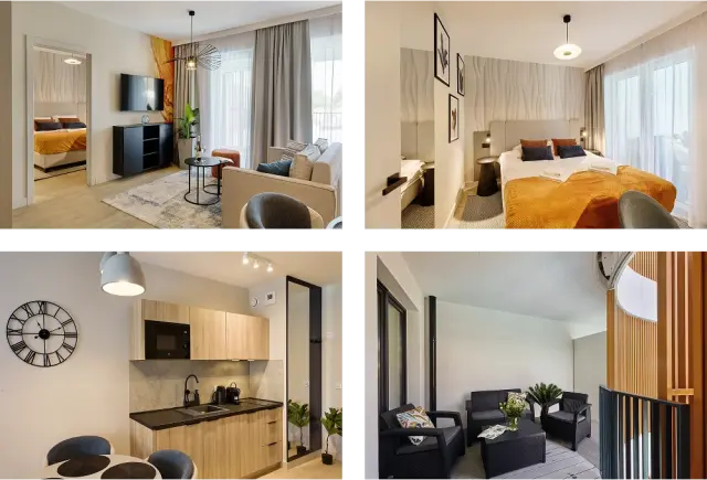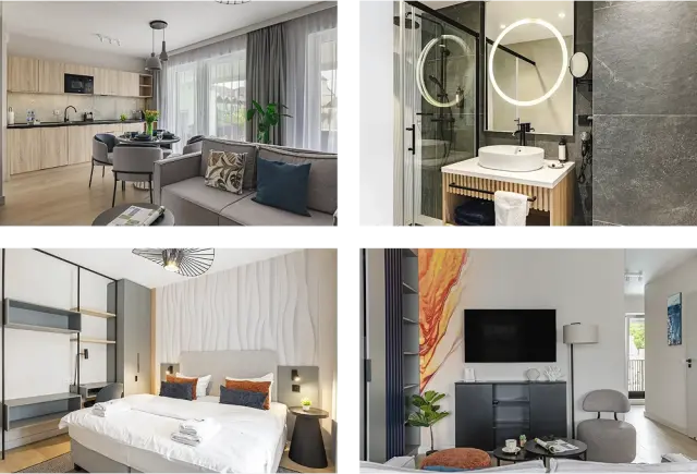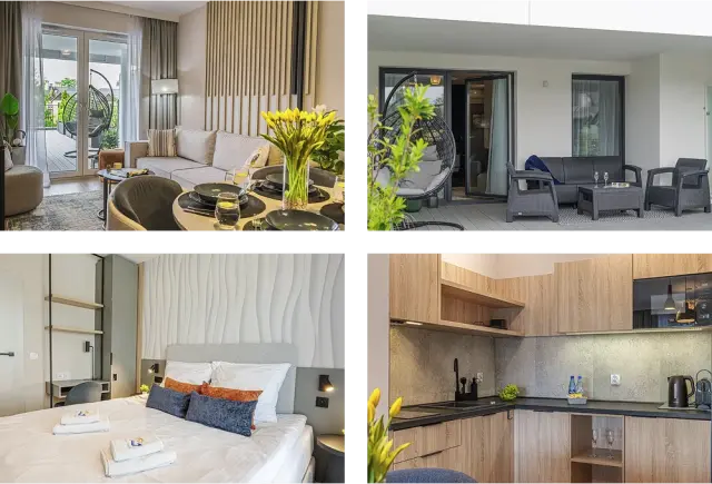 Ten przestronny apartament łączy elegancję z wygodą, oferując wyjątkową przestrzeń do wypoczynku. Na gości czeka duży, prywatny taras, idealny do relaksu na świeżym powietrzu. W pełni wyposażony aneks kuchenny pozwala na przygotowanie posiłków, a komfortowy salon z telewizorem i klimatyzacją stwarza doskonałe warunki do odpoczynku. Apartament posiada również przytulną sypialnię i łazienkę, zapewniając pełen komfort i prywatność.